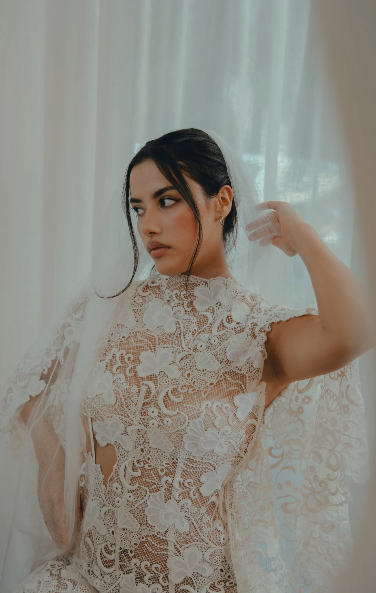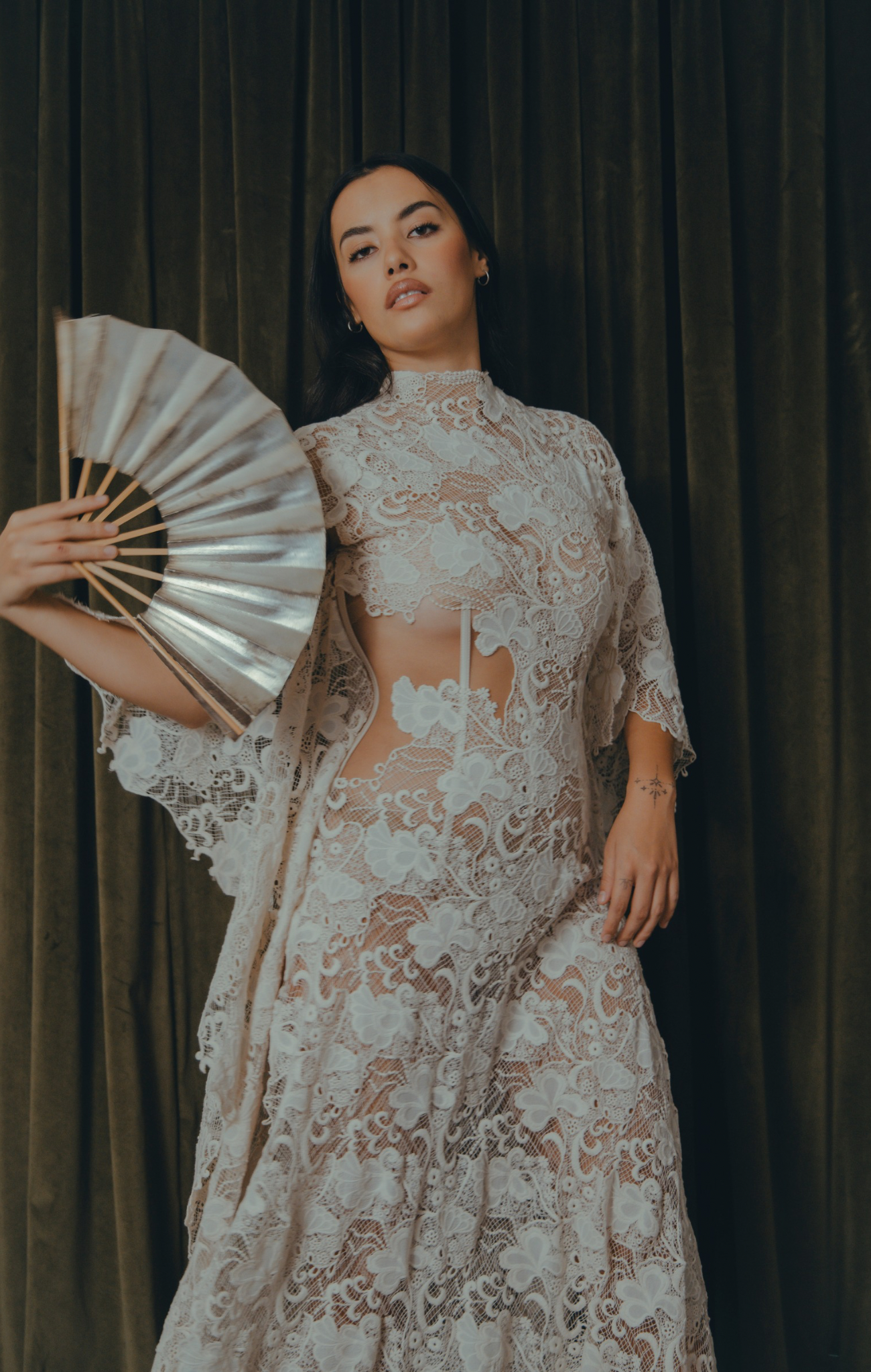 The Fiore Gown is a study in lace and craftsmanship, created entirely from 100% cotton lace. Every seam is hand-stitched using a couture overlapping technique—ensuring that no straight seams are visible, just an uninterrupted flow of intricate florals. All lace edges are hand cut for organic lines including the high neckline.